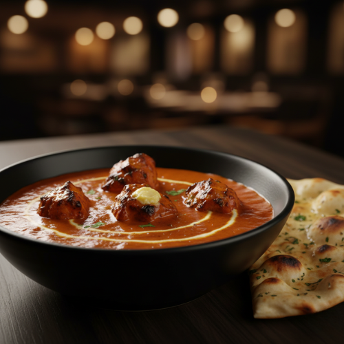 Tender chicken cooked in creamy tomato butter sauce. Rich smooth and mildly spiced (with rice)