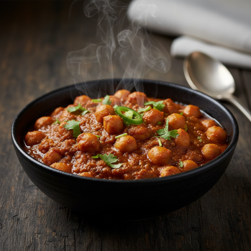 Chickpeas cooked in tomato gravy. Hearty and filling (with rice)