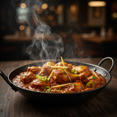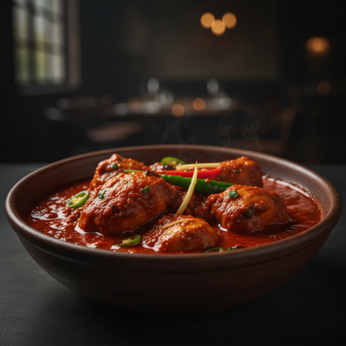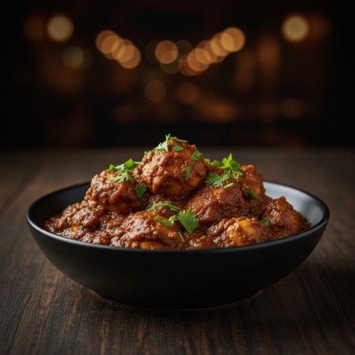 Chicken slow cooked in thick spiced gravy. Rich intense and aromatic (with rice)