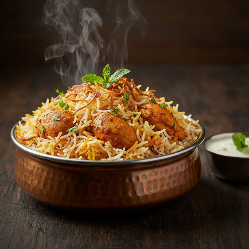 Fragrant basmati rice cooked with spiced chicken. Aromatic and filling. With raita sauce.