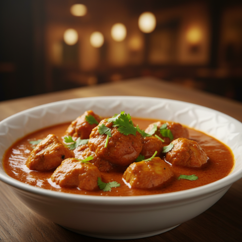 Butter chicken in creamy tomato sauce. Mild rich and popular (with rice)