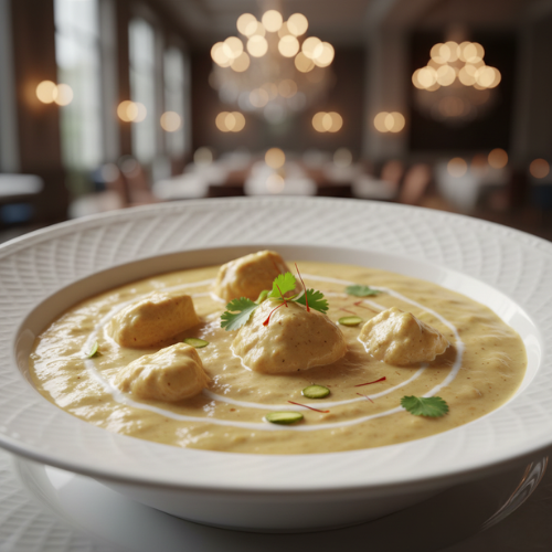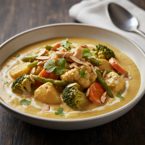 Mild chicken curry with cream and nuts. Smooth rich and delicate (with rice)