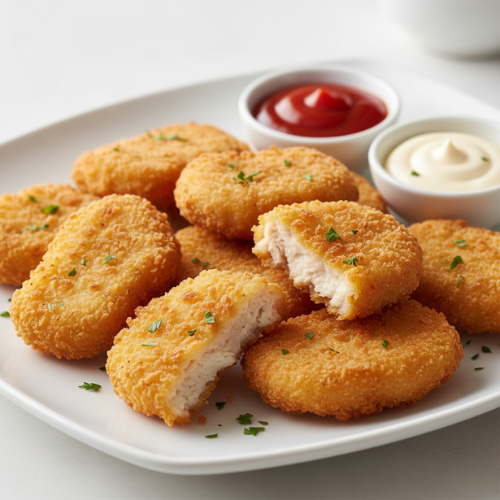 Crispy chicken nuggets fried golden. Perfect for kids.