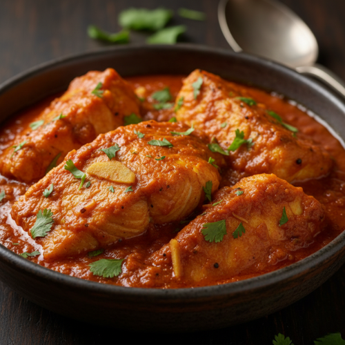 Fish cooked in spiced masala sauce. Rich and aromatic (with rice)