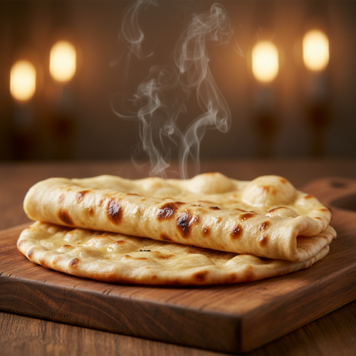 Soft naan brushed with butter. Fluffy and rich.