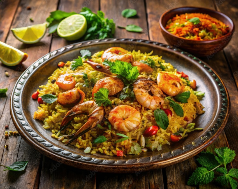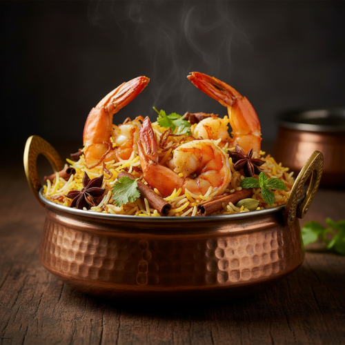 Juicy prawns cooked with fragrant rice. Seafood delight. With raita sauce.