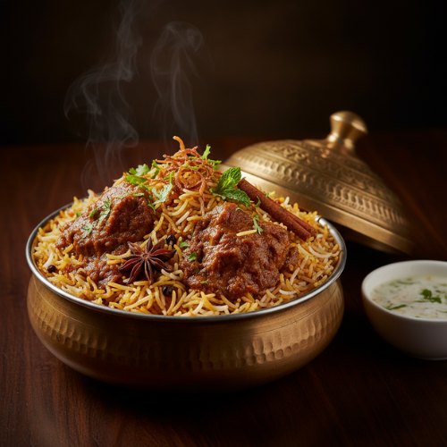 Slow cooked lamb layered with rice. Rich and flavorful. With raita sauce.
