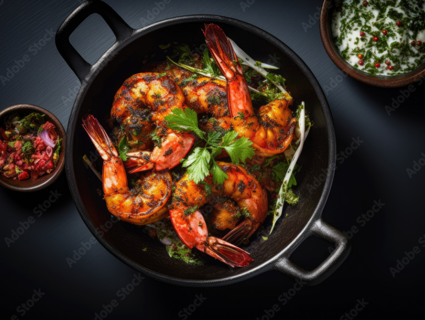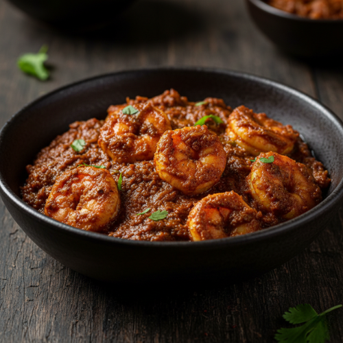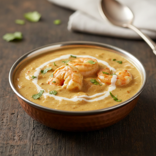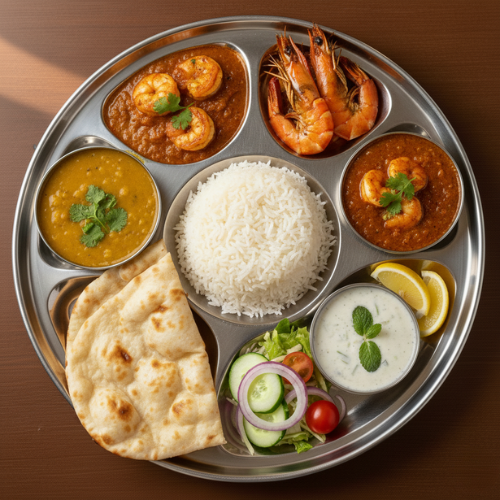 Prawn curry with sides. Premium seafood meal.