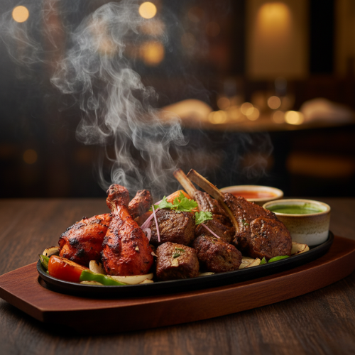 Selection of grilled meats and prawns. Perfect for sharing. With curry sauce or raita sauce.