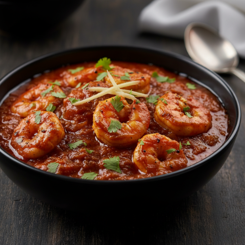 Prawns cooked in thick tomato masala. Bold and aromatic (with rice)