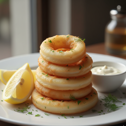 Tender squid rings lightly seasoned and fried. Golden crispy and delicious.
