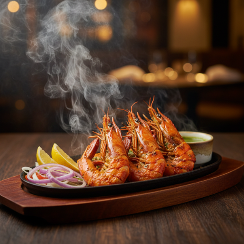 Juicy prawns coated in spiced gram flour batter. Crispy seafood starter full of authentic flavor.
