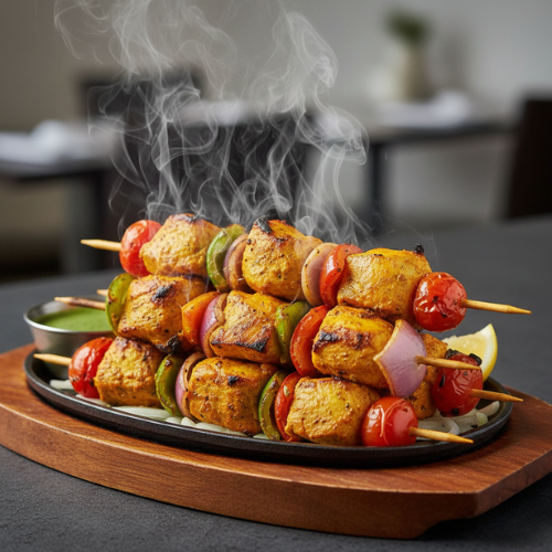 Boneless chicken grilled with spices. Soft and smoky. With curry sauce or raita sauce.