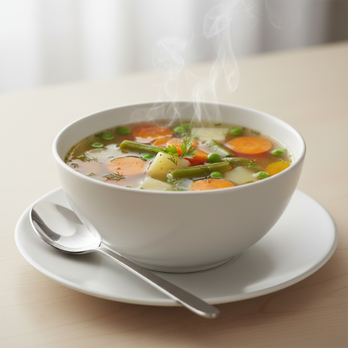 Light soup prepared with fresh vegetables. Healthy and gently seasoned.