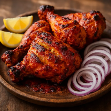 Chicken marinated and grilled in tandoor. Tender and smoky. With curry sauce or raita sauce.