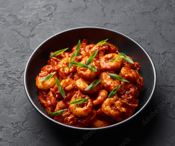 Prawns cooked in spiced curry sauce. Classic seafood dish (with rice)